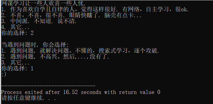 //测试你是哪一类学习者 #include <stdio.h> int main() { int answer; char words[5000]; printf("网课学习让一些人欢喜一些人忧.\n"); printf("1. 作为喜欢自学且自律的人,觉得这样很好. 有网络,自主学习,很ok.\n"); printf("2. 不喜,不喜,很不喜. 眼睛快瞎了. 脑壳有点卡...\n"); printf("3. 中间派. 不知道. 说不清.\n"); printf("4. 其它...\n"); printf("你的选择: "); scanf("%d", &answer); if(answer == 4) { printf("请补充说明你的想法: \n"); getchar(); gets(words); } printf("\n"); printf("当遇到问题时, 你会选择:\n"); printf("1. 遇到问题, 就解决问题。不懂的,搜索式学习,逐个攻破.\n"); printf("2. 遇到问题, 不高兴。然后,...,没有了.\n"); printf("3. 其它...\n"); printf("你的选择: "); scanf("%d", &answer); if(answer == 1) printf(":)\n"); else if(answer == 2) printf("这样不能解决问题啊...我们选择1好不好:)\n"); else if(answer == 3) { printf("请补充说明你的想法: \n"); getchar(); gets(words); } return 0; }