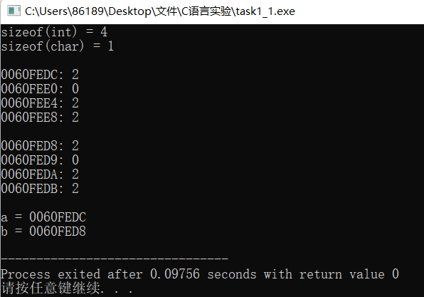 1 #include <stdio.h> 2 #define N 4 3 4 int main() 5 { 6 int a[N] = {2, 0, 2, 2}; 7 char b[N] = {'2', '0', '2', '2'}; 8 int i; 9 10 printf("sizeof(int) = %d\n", sizeof(int)); 11 printf("sizeof(char) = %d\n", sizeof(char)); 12 printf("\n"); 13 14 // 输出数组a中每个元素的地址、值 15 for (i = 0; i < N; ++i) 16 printf("%p: %d\n", &a[i], a[i]); 17 18 printf("\n"); 19 20 // 输出数组b中每个元素的地址、值 21 for (i = 0; i < N; ++i) 22 printf("%p: %c\n", &b[i], b[i]); 23 24 printf("\n"); 25 26 // 输出数组名a和b对应的值 27 printf("a = %p\n", a); 28 printf("b = %p\n", b); 29 30 return 0; 31 }