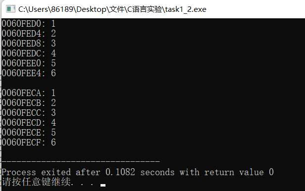 1 #include <stdio.h> 2 #define N 2 3 #define M 3 4 5 int main() 6 { 7 int a[N][M] = {{1, 2, 3}, {4, 5, 6}}; 8 char b[N][M] = {{'1', '2', '3'}, {'4', '5', '6'}}; 9 int i, j; 10 11 // 输出二维数组a中每个元素的地址和值 12 for (i = 0; i < N; ++i) 13 for (j = 0; j < M; ++j) 14 printf("%p: %d\n", &a[i][j], a[i][j]); 15 16 printf("\n"); 17 18 // 输出二维数组a中每个元素的地址和值 19 for (i = 0; i < N; ++i) 20 for (j = 0; j < M; ++j) 21 printf("%p: %c\n", &b[i][j], b[i][j]); 22 23 return 0; 24 }