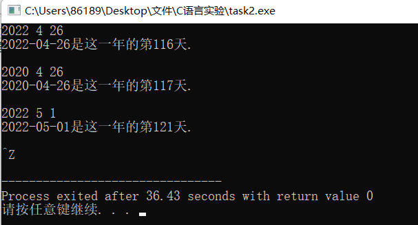 1 #include <stdio.h> 2 3 int days_of_year(int year, int month, int day); // 函数声明 4 5 int main() 6 { 7 int year, month, day; 8 int days; 9 10 while(scanf("%d%d%d", &year, &month, &day) != EOF) // 按下Ctrl+Z终止 11 { 12 days = days_of_year(year, month, day); // 函数调用 13 printf("%4d-%02d-%02d是这一年的第%d天.\n\n", year, month, day, days); 14 } 15 16 return 0; 17 } 18 19 20 int days_of_year(int year, int month, int day) 21 { 22 int s=0,flag=0,i; 23 if((year%4==0&&year%100!=0)||year%400==0) 24 { 25 flag=1; 26 } 27 if (month<=7) 28 { 29 for(i=1;i<=month-1;i++) 30 { 31 if(i==2) 32 { 33 if(flag==1) 34 s+=29; 35 else 36 s+=28; 37 } 38 else if(i%2==1) 39 { 40 s+=31; 41 } 42 else 43 { 44 s+=30; 45 } 46 } 47 s+=day; 48 } 49 if(month>=8) 50 { 51 for(i=1;i<=7;i++) 52 { 53 if(i==2) 54 { 55 if(flag==1) 56 s+=29; 57 else 58 s+=28; 59 } 60 else if(i%2==1) 61 { 62 s+=31; 63 } 64 else 65 { 66 s+=30; 67 } 68 } 69 for(i=8;i<=month-1;i++) 70 { 71 if(i%2==1) 72 { 73 s+=31; 74 } 75 else 76 { 77 s+=30; 78 } 79 s+=day; 80 } 81 } 82 return s; 83 }