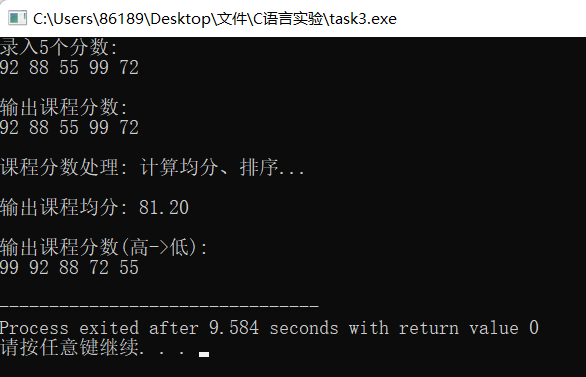 1 #include <stdio.h> 2 #define N 5 3 4 // 函数声明 5 void input(int x[], int n); 6 void output(int x[], int n); 7 double average(int x[], int n); 8 void sort(int x[], int n); 9 10 int main() 11 { 12 int scores[N]; 13 double ave; 14 15 printf("录入%d个分数:\n", N); 16 input(scores, N); 17 18 printf("\n输出课程分数: \n"); 19 output(scores, N); 20 21 printf("\n课程分数处理: 计算均分、排序...\n"); 22 ave = average(scores, N); 23 sort(scores, N); 24 25 printf("\n输出课程均分: %.2f\n", ave); 26 printf("\n输出课程分数(高->低):\n"); 27 output(scores, N); 28 29 return 0; 30 } 31 32 // 函数定义 33 // 输入n个整数保存到整型数组x中 34 void input(int x[], int n) 35 { 36 int i; 37 38 for(i=0; i<n; ++i) 39 scanf("%d", &x[i]); 40 } 41 42 // 输出整型数组x中n个元素 43 void output(int x[], int n) 44 { 45 int i; 46 47 for(i=0; i<n; ++i) 48 printf("%d ", x[i]); 49 50 printf("\n"); 51 } 52 53 // 计算整型数组x中n个元素均值,并返回 54 // 补足函数average()实现 55 double average(int x[], int n) 56 { 57 double s=0.0,aver; 58 int i; 59 for(i=0;i<n;++i) 60 { 61 s+=x[i]; 62 } 63 aver=s/n; 64 return aver; 65 66 } 67 68 // 对整型数组x中的n个元素降序排序 69 // 补足函数sort()实现 70 void sort(int x[], int n) 71 { 72 int i,j,temp; 73 for(i=0;i<n-1;++i) 74 { 75 for(j=0;j<n-i-1;++j) 76 { 77 if(x[j]<x[j+1]) 78 { 79 temp=x[j]; 80 x[j]=x[j+1]; 81 x[j+1]=temp; 82 } 83 } 84 } 85 }