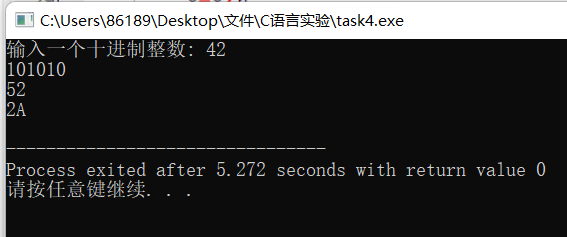 1 #include <stdio.h> 2 void dec2n(int x, int n); // 函数声明 3 4 int main() 5 { 6 int x; 7 8 printf("输入一个十进制整数: "); 9 scanf("%d", &x); 10 11 dec2n(x, 2); // 函数调用: 把x转换成二进制输出 12 dec2n(x, 8); // 函数调用: 把x转换成八进制输出 13 dec2n(x, 16); // 函数调用: 把x转换成十六进制输出 14 15 return 0; 16 } 17 18 // 函数定义 19 // 功能: 把十进制数x转换成n进制,打印输出 20 // 补足函数实现 21 void dec2n(int x, int n) 22 { 23 int i=0,c=0,t; 24 int a[100]; 25 while(x!=0) 26 { 27 a[i]=x%n; 28 c+=1; 29 x=x/n; 30 i+=1; 31 } 32 33 for(t=c-1;t>=0;t--) 34 { 35 if(a[t]<10) 36 printf("%d",a[t]); 37 else if(a[t]==10) 38 printf("A"); 39 else if(a[t]==11) 40 printf("B"); 41 else if(a[t]==12) 42 printf("C"); 43 else if(a[t]==13) 44 printf("D"); 45 else if(a[t]==14) 46 printf("E"); 47 else if(a[t]==15) 48 printf("F"); 49 50 } 51 printf("\n"); 52 }