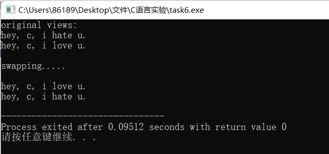 1 #include <stdio.h> 2 #define N 80 3 4 int main() 5 { 6 char views1[N] = "hey, c, i hate u."; 7 char views2[N] = "hey, c, i love u."; 8 9 char temps[N]; 10 int i=0; 11 printf("original views:\n"); 12 puts(views1); 13 puts(views2); 14 printf("\n"); 15 while(views1[i]!='\0') 16 { 17 temps[i]=views1[i]; 18 views1[i]=views2[i]; 19 views2[i]=temps[i]; 20 i+=1; 21 } 22 printf("swapping.....\n\n"); 23 puts(views1); 24 puts(views2); 25 26 return 0; 27 }