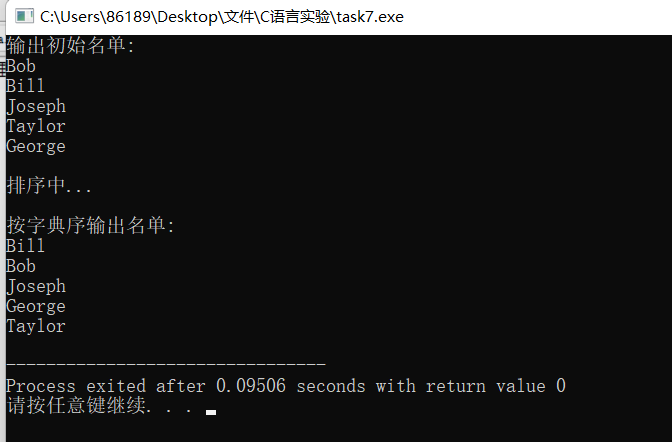 1 #include <stdio.h> 2 #include <string.h> 3 4 #define N 5 5 #define M 20 6 7 void bubble_sort(char str[][M], int n); // 函数声明 8 9 int main() 10 { 11 char name[][M] = {"Bob", "Bill", "Joseph", "Taylor", "George"}; 12 int i; 13 14 printf("输出初始名单:\n"); 15 for (i = 0; i < N; i++) 16 printf("%s\n", name[i]); 17 18 printf("\n排序中...\n"); 19 bubble_sort(name, N); // 函数调用 20 21 printf("\n按字典序输出名单:\n"); 22 for (i = 0; i < N; i++) 23 printf("%s\n", name[i]); 24 25 return 0; 26 } 27 void bubble_sort(char str[][M], int n) 28 { 29 int i; 30 char temp[20]; 31 for(i=0;i<n-1;i++) 32 { 33 if(strcmp(str[i],str[i+1])>0) 34 { 35 strcpy(temp,str[i]); 36 strcpy(str[i],str[i+1]); 37 strcpy(str[i+1],temp); 38 } 39 } 40 }
