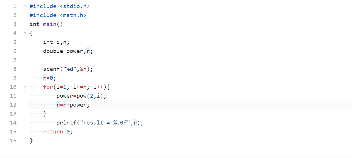 数据表达:变量为i,n,power,r,其中power=pow(2,i);应用了整型和双精度浮点型。