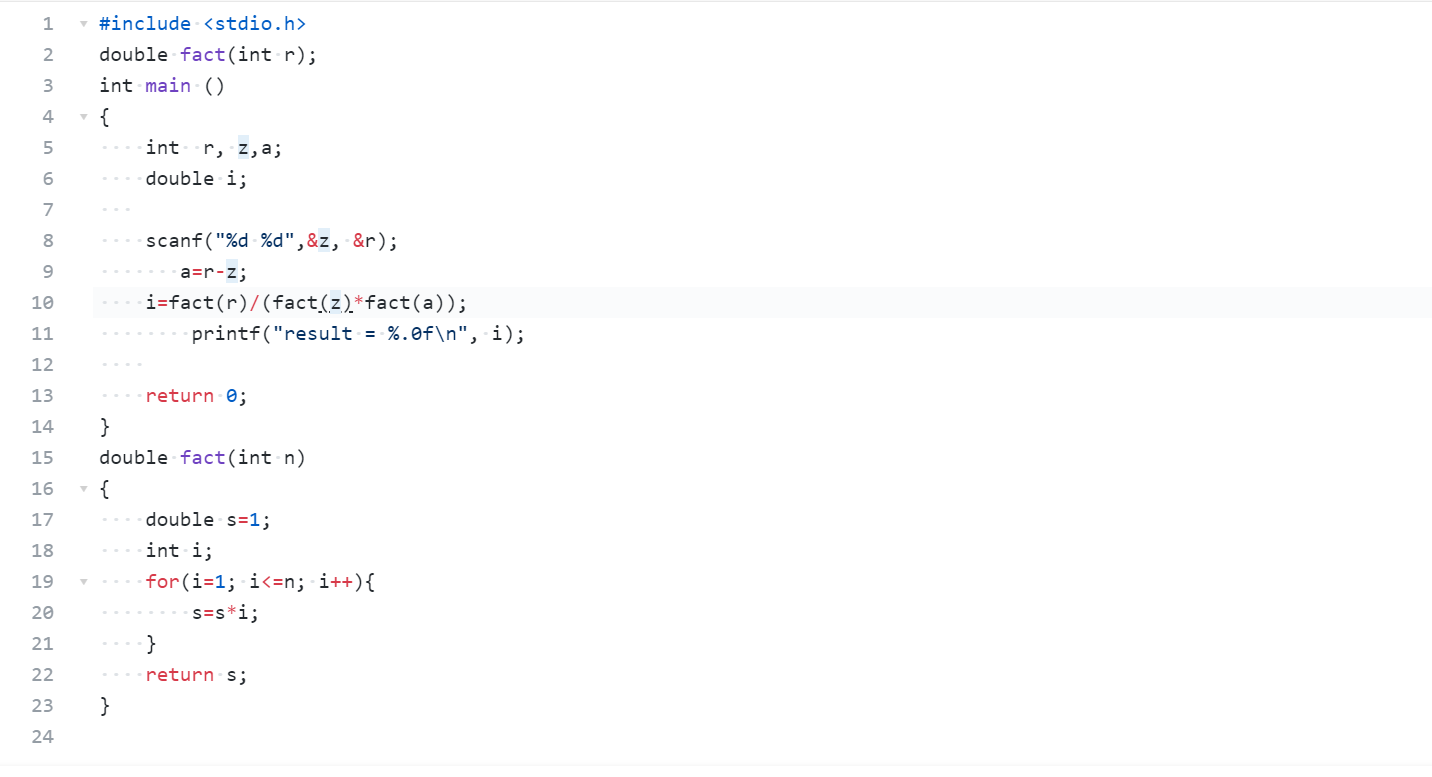 数据处理:用到了for循环语句,scanf语句,和自定义函数fact(r)计算阶乘。