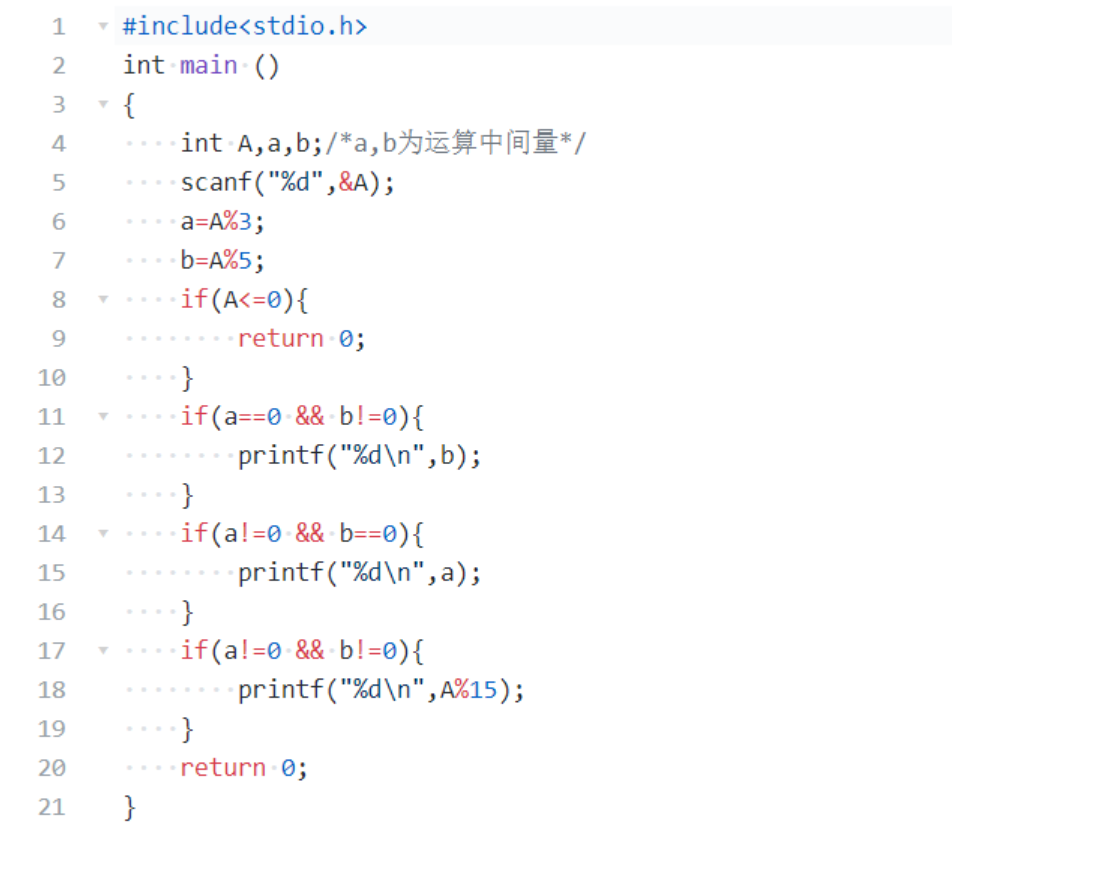 键盘输入1个正的整数A,如果A是3的倍数但不是5的倍数,则输出A除以5的余数。如果A是5的倍数但是不是3的倍数,则输出A除以3的余数。如果A既不是5的倍数但也不是3的倍数,输出A除以15的余数