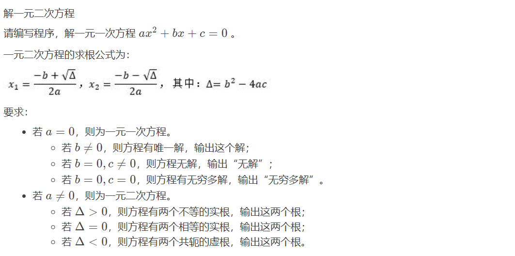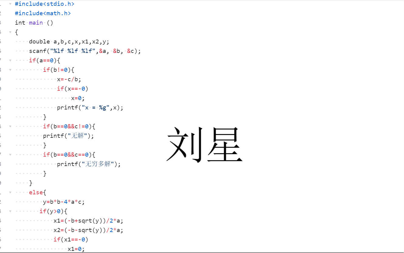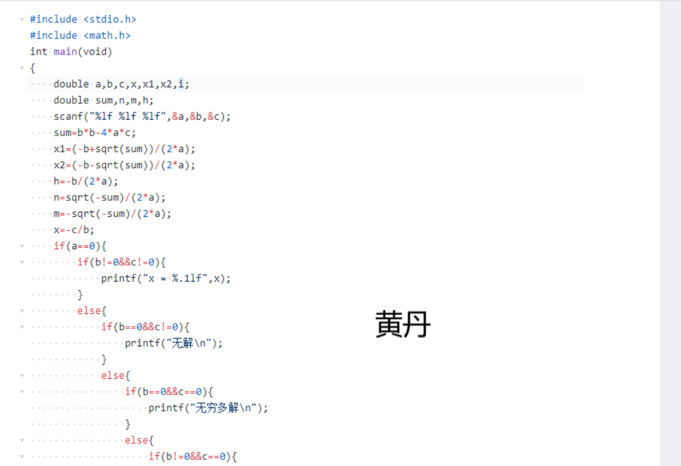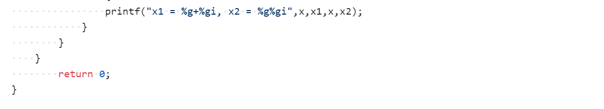 数据表达:本题变量为a,b,c,x1,x2,x,y;a,b,c三者通过输入得到,变量都为双精度浮点型。