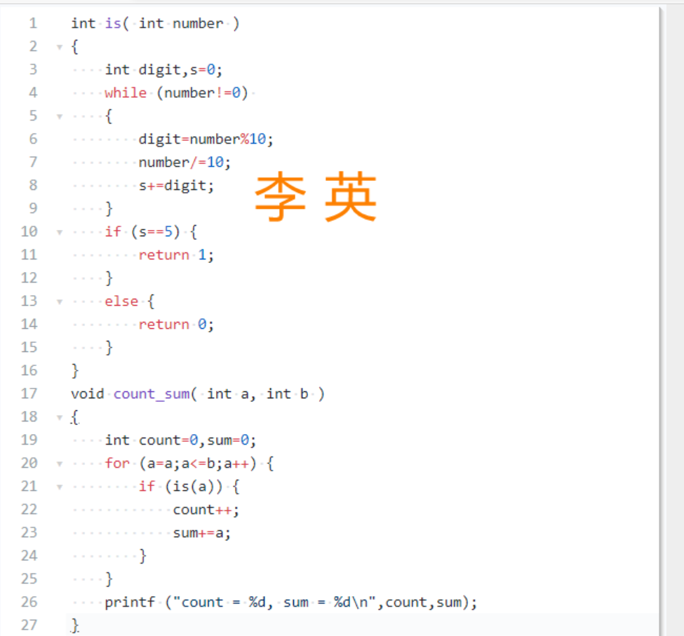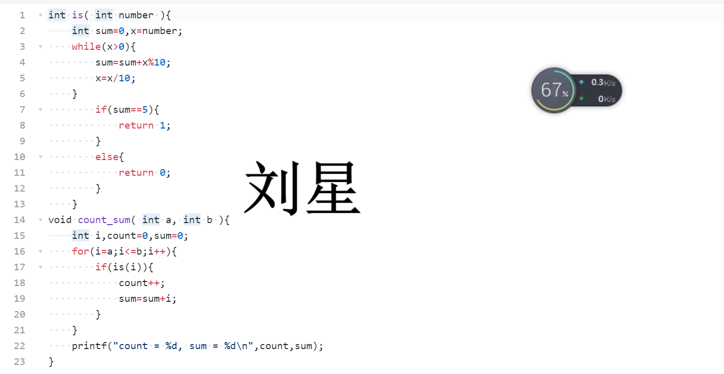 函数count_sum利用函数is统计给定区间[a, b]内有多少个满足上述要求(即令is返回1)的整数,并计算这些整数的和。最后按照格式