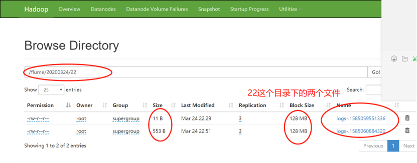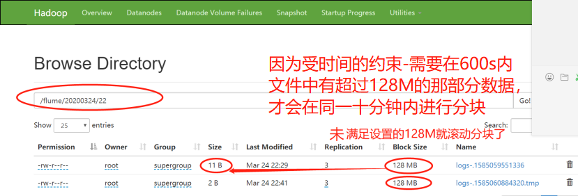 此时22目录下面的两个文件的大小依然未改变,表明:生成后的文件不会再被写进数据,即使它大小不足128MB-134217700byte