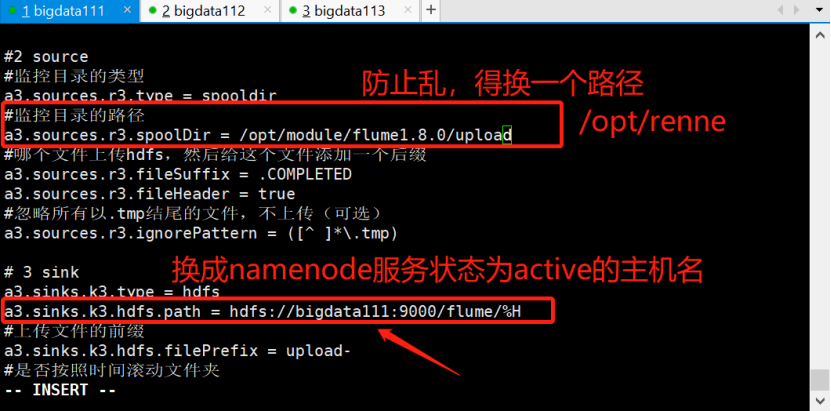 #2 source #监控目录的类型 a3.sources.r3.type = spooldir #监控目录的路径-自定义 a3.sources.r3.spoolDir = /opt/renne #哪个文件上传hdfs,然后给这个文件添加一个后缀 a3.sources.r3.fileSuffix = .COMPLETED a3.sources.r3.fileHeader = true #忽略所有以.tmp结尾的文件,不上传(可选) a3.sources.r3.ignorePattern = ([^ ]*\.tmp)