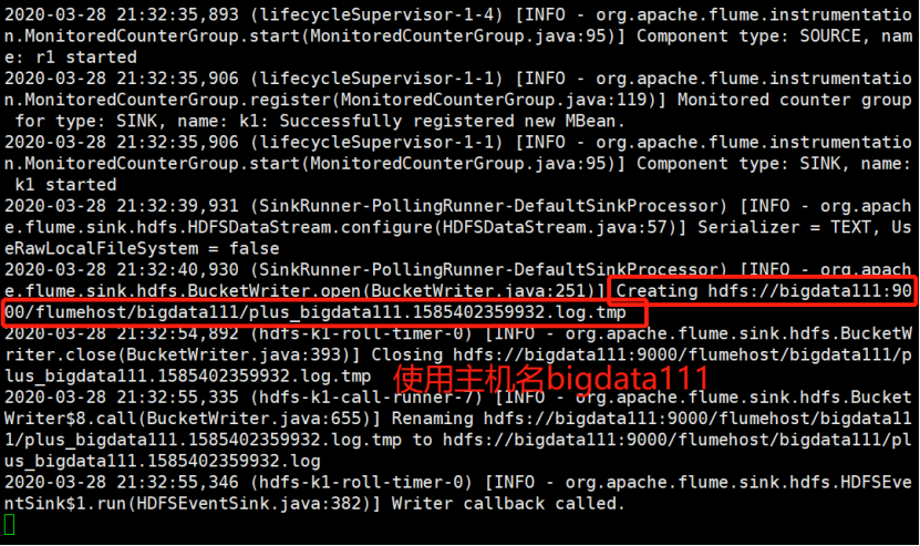 [root@bigdata111 myconf]# flume-ng agent -c ../conf/ -n a1 -f flume-host.conf -Dflume.root.logger=INFO,console |