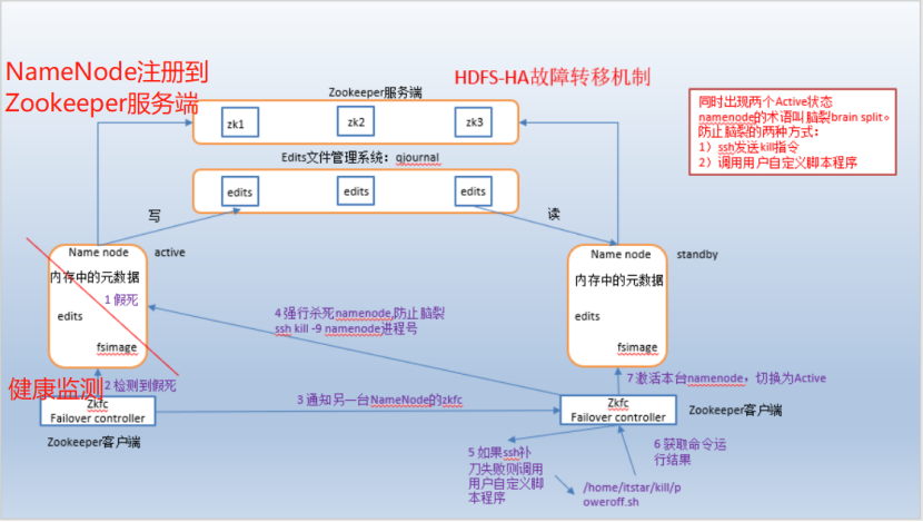 实现了一个zkfailover,常驻在每一个namenode所在的节点,每一个zkfailover(自动故障转移)负责监控自己所在namenode节点,利用zk进行状态标识,当需要进行状态切换时,由zkfailover来负责切换,切换时需要防止brain split现象的发生。