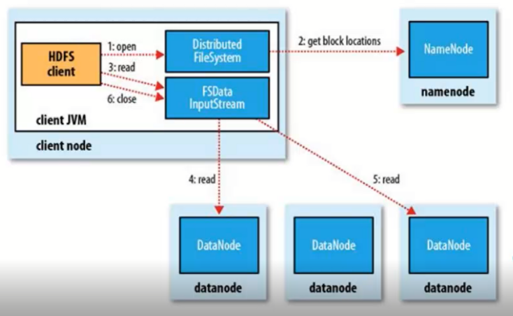 - 前两步会返回一个FSDataInputStream对象,该对象会被封装成DFSInputStream对象,DFSInputStream可以方便的管理datanode和namenode数据流。客户端调用read方法,DFSInputStream就会找出离客户端最近的datanode 并连接。