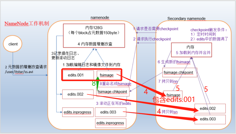 (2)一分钟检查一次操作次数,当操作次数达到1百万时,SecondaryNameNode执行一次。