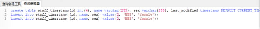 先在mysql中建表并插入几条数据: mysql> create table staff_timestamp(id int(4), name varchar(255), sex varchar(255), last_modified timestamp DEFAULT CURRENT_TIMESTAMP ON UPDATE CURRENT_TIMESTAMP); mysql> insert into staff_timestamp (id, name, sex) values(1, 'AAA', 'female'); mysql> insert into staff_timestamp (id, name, sex) values(2, 'BBB', 'female'); 先导入一部分数据: $ bin/sqoop import \ --connect jdbc:mysql://bigdata111:3306/test \ --username root \ --password 000000 \ --table staff_timestamp \ --delete-target-dir \ --hive-import \ --fields-terminated-by "\t" \ --m 1 再增量导入一部分数据: mysql> insert into staff_timestamp (id, name, sex) values(3, 'CCC', 'female');