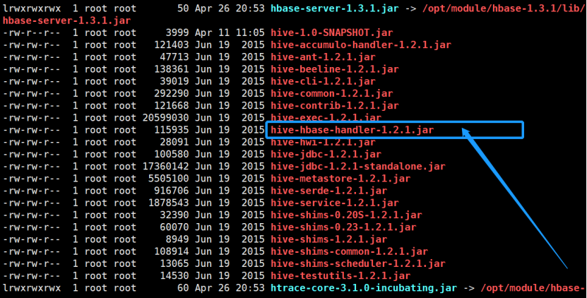 因为我们后续可能会在操作Hive的同时对HBase也会产生影响,所以Hive需要持有操作HBase的Jar,那么接下来拷贝Hive所依赖的Jar包(或者使用软连接的形式)。