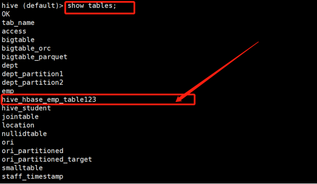 接下来就能够看到在hive和hbase上分别有创建了一个表:hive_hbase_emp_table123、hbase_emp_table123。