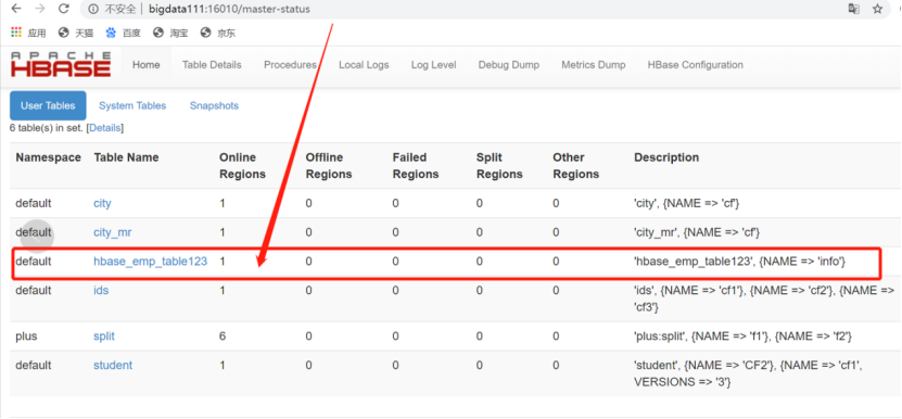 尖叫提示:完成之后,可以分别进入Hive和HBase查看,都生成了对应的表。