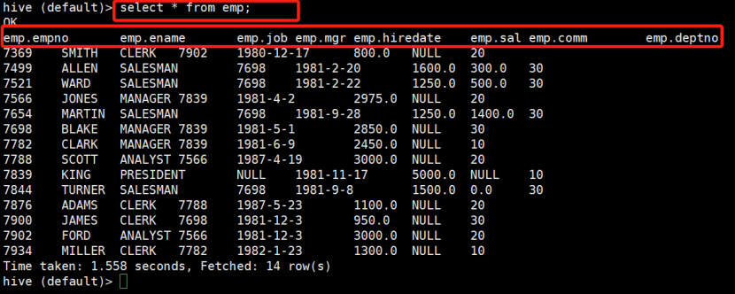 CREATE TABLE emp( empno int, ename string, job string, mgr int, hiredate string, sal double, comm double, deptno int) row format delimited fields terminated by '\t'; |