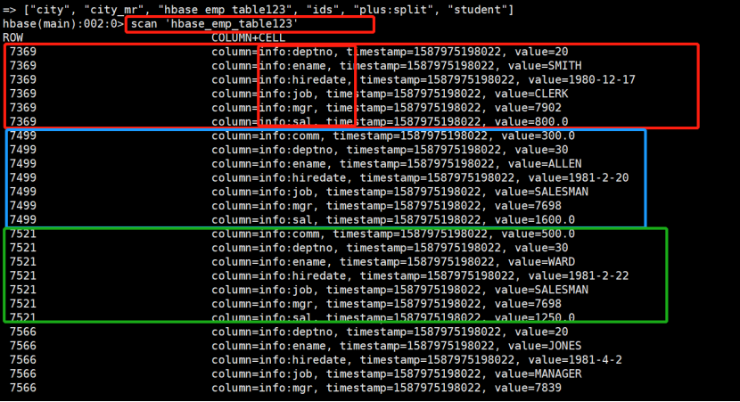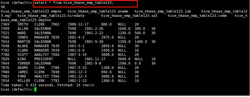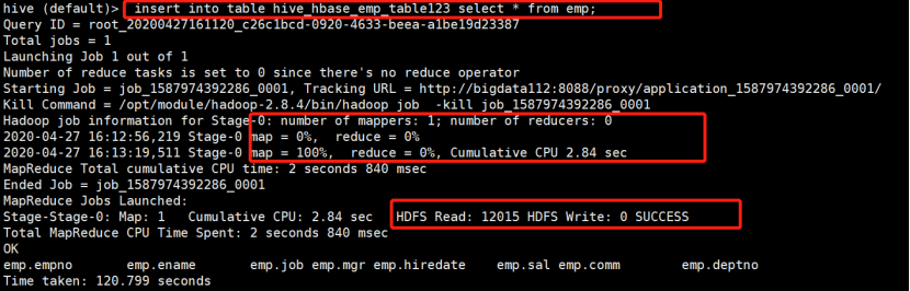 hive (default)> insert into table hive_hbase_emp_table123 select * from emp; |
