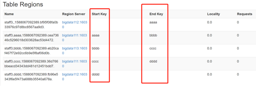 create 'staff3','partition3',SPLITS_FILE => '/opt/module/hbase-1.3.1/splits.txt' |