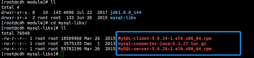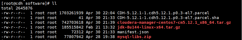 #注意:必须是Oracle JDK、不要使用OpenJDK jdk-8u144-linux-x64.tar.gz CDH-5.12.1-1.cdh5.12.1.p0.3-el7.parcel CDH-5.12.1-1.cdh5.12.1.p0.3-el7.parcel.sha cloudera-manager-centos7-cm5.12.1_x86_64.tar.gz manifest.json mysql5.7或者mysql-libs(这里就是mysql5.6)