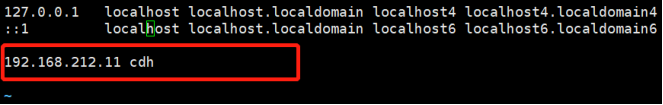 vi /etc/hosts 如果是三台的集群的话,就需要将集群的各个主机的IP、名字都写进去。(我这里只先配了一台) 192.168.212.11 cdh |