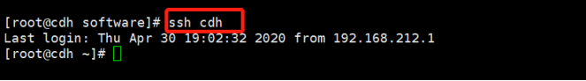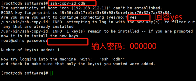 #生成公钥 ssh-keygen -t rsa 过程中询问问题都不回答,直接回车(三次) #拷贝公钥到其他节点(如果是集群的话需要九遍),比如: ssh-copy-id cdh1 ssh-copy-id cdh2 ssh-copy-id cdh3 我这里只配单个的cdh,所以就是: ssh-copy-id cdh