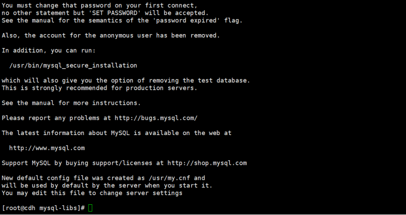 [root@cdh mysql-libs]# mysql -uroot -p2RIossrI4IioOnaA