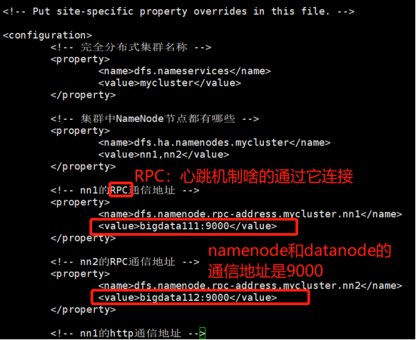 <!-- nn1的RPC通信地址 --> <property> <name>dfs.namenode.rpc-address.mycluster.nn1</name> <value>centos1:9000</value> </property>