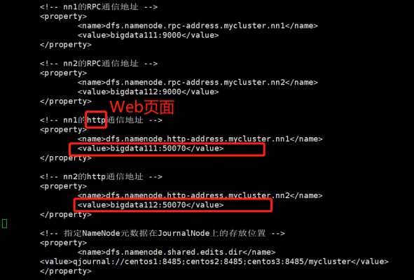 <!-- nn1的http通信地址 --> <property> <name>dfs.namenode.http-address.mycluster.nn1</name> <value>centos1:50070</value> </property>
