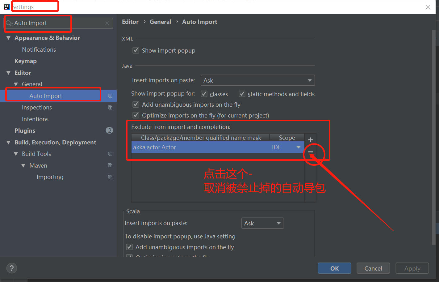 3.被Exclude的列表:像我这里就有akka.actor.Actor,点击 - 取消禁止即可
