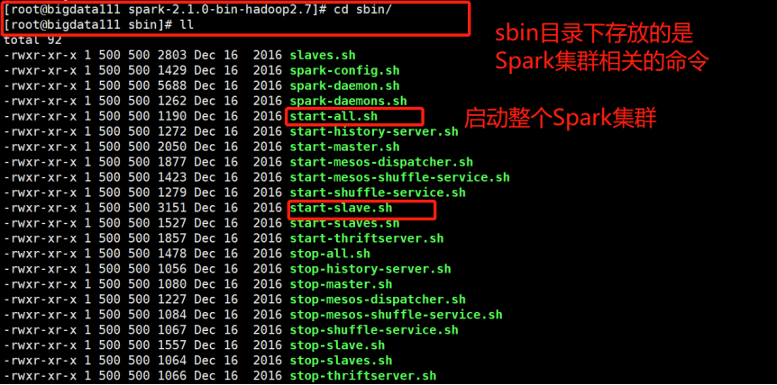 [root@bigdata111 spark-2.1.0-bin-hadoop2.7]# cd /usr/local/spark-2.1.0-bin-hadoop2.7/sbin/
