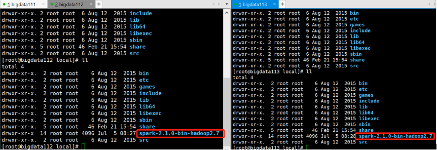 2)将bigdata111上的spark-2.1.0-bin-hadoop2.7上传到bigdata112和bigdata113上: