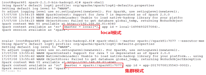 操作过程概述:(1)启动Spark Shell:spark-shell (停止是:scala> :quit)也可以使用以下参数: 参数说明: --master spark://spark81:7077 指定Master的地址 --executor-memory 2g 指定每个worker可用内存为2G --total-executor-cores 2 指定整个集群使用的cup核数为2个 例如: spark-shell --master spark://spark81:7077 --executor-memory 2g --total-executor-cores 2 [root@bigdata111 spark-2.1.0-bin-hadoop2.7]# ./bin/spark-shell --master spark://bigdata111:7077 (2)注意:如果启动spark shell时没有指定master地址,但是也可以正常启动spark shell和执行spark shell中的程序,其实是启动了spark的local模式,该模式仅在本机启动一个进程,没有与集群建立联系。 请注意local模式和集群模式的日志区别:
