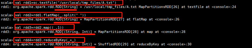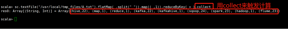 (3)在Spark Shell中编写WordCount程序程序如下: sc.textFile("hdfs://192.168.88.111:9000/data/data.txt").flatMap(_.split(" ")).map((_,1)).reduceByKey(_+_).saveAsTextFile("hdfs://192.168.88.111:9000/output/spark/wc") 说明: