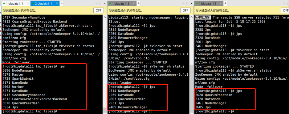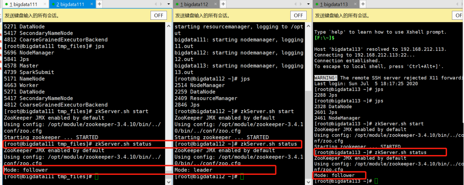 (2)启动Zookeeper(三台可同步启动)、查看状态