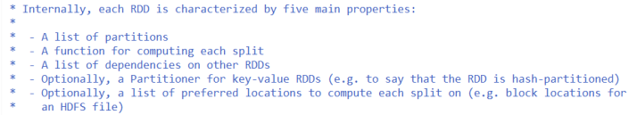 (5)一个列表,存储存取每个Partition的优先位置(preferred location)。对于一个HDFS文件来说,这个列表保存的就是每个Partition所在的块的位置。按照“移动数据不如移动计算”的理念,Spark在进行任务调度的时候,会尽可能地将计算任务分配到其所要处理数据块的存储位置。