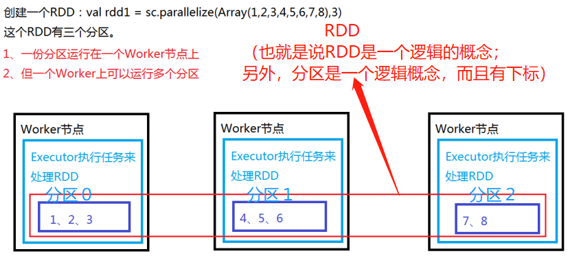 理解:RDD是由分区组成(RDD就是一个分区的集合),每个分区运行在不同的worker上,通过这种方式,实现了分布式计算。