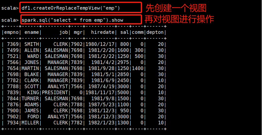 ① 将DataFrame注册成表(视图):df.createOrReplaceTempView("emp")