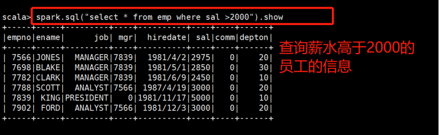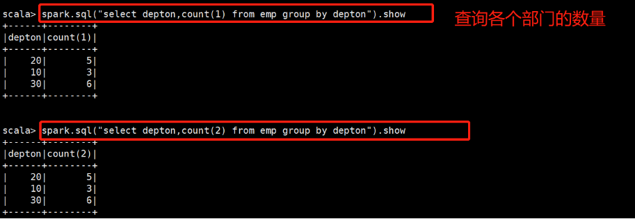 spark.sql("select deptno,sum(sal) from emp group by deptno").show