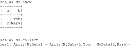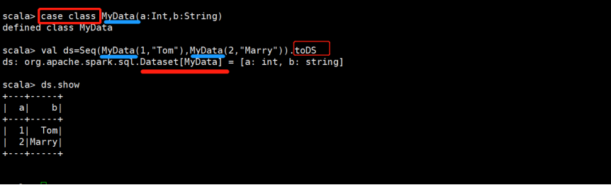 val ds = Seq(MyData(1,"Tom"),MyData(2,"Mary")).toDS