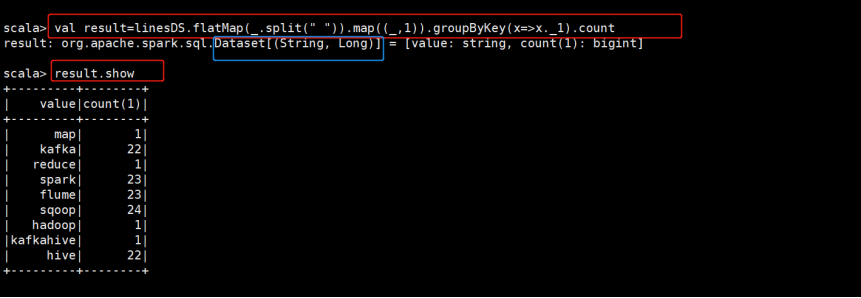 val result = linesDS.flatMap(_.split(" ")).map((_,1)).groupByKey(x => x._1).count