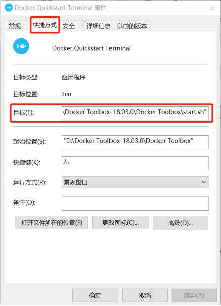 右键Docker Quickstart-->属性-->快捷方式-->目标