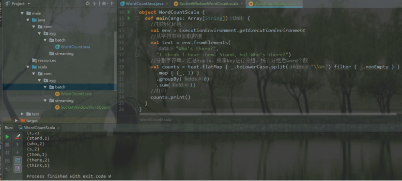 object WordCountScala{ def main(args: Array[String]) { //初始化环境 val env = ExecutionEnvironment.getExecutionEnvironment //从字符串中加载数据 val text = env.fromElements( "Who's there?", "I think I hear them. Stand, ho! Who's there?") //分割字符串、汇总tuple、按照key进行分组、统计分组后word个数 val counts = text.flatMap { _.toLowerCase.split("\\W+") filter { _.nonEmpty } } .map { (_, 1) } .groupBy(0) .sum(1) //打印 counts.print() } } |