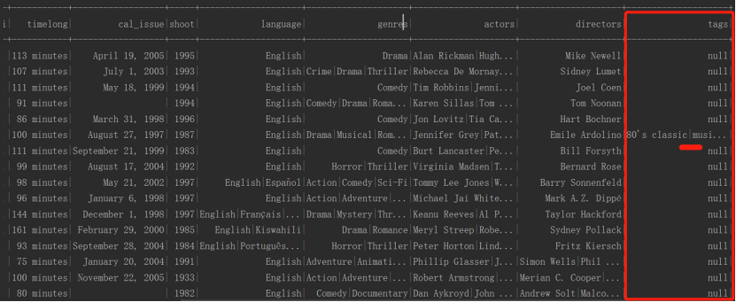 .select("mid","name","descri","timelong","cal_issue","shoot","language","genres","actors","directors","tags")