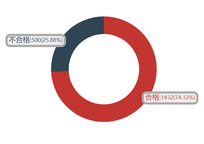 <!DOCTYPE html> <html> <head> <meta charset="UTF-8"> <title>环形图</title> <script type="text/javascript" src="js/echarts_56.js"></script> <style type="text/css"> #main{ width: 600px; height: 400px; } </style> </head> <body> <div id="main"></div> <script type="text/javascript"> var edom=document.getElementById("main"); var myChart=echarts.init(edom); var option={ series:[{ type:'pie', radius:['60%','40%'], avoidLableOverlap:false,//标签重叠问题 当avoidLabelOverlap设置为false时会出现以下情况 改为true之后就不会重叠 animation:false,//禁用饼状图悬浮动效果图 //饼图图形上的文本标签,可用于说明图形的一些数据信息,比如值,名称等, label:{ //formatter配置rich(富文本样式)。 formatter:'{b|{b}:}{c}({per|{d}%})',//文字内容显示 backgroundColor:'#eee',//背景 borderColor:'#aaa',//边框颜色 borderWidth:5, //边框宽度 padding:5, //矩形内容距离外边框的距离 borderRadius:8,//圆角度 rich:{ b:{ fontSize:16, lineHeight:15 }, per:{ align:'center' } } }, data:[{value:1432,name:'合格'}, {value:500,name:'不合格'}] }] }; myChart.setOption(option); </script> </body> </html>