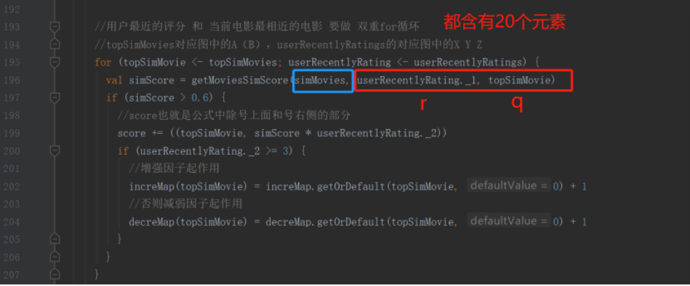 2. 计算待选电影的推荐分数的时候,为什么要将“Rr-用户最近对电影r的评分userRecentlyRatings”和电影P最相似的K个电影--用共享变量的方式”进行双重for循环?