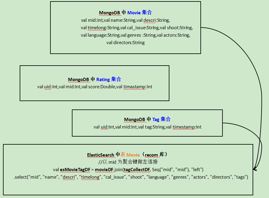 package test /** * @Author : ASUS and xinrong * @Version : 2020/9/4 * 数据格式转换类 * ---------------电影表------------------------ * 1 * Toy Story (1995) * * 81 minutes * March 20, 2001 * 1995 * English * Adventure|Animation|Children|Comedy|Fantasy * Tom Hanks|Tim Allen|Don Rickles|Jim Varney|Wallace Shawn|John Ratzenberger|Annie Potts|John Morris|Erik von Detten|Laurie Metcalf|R. Lee Ermey|Sarah Freeman|Penn Jillette|Tom Hanks|Tim Allen|Don Rickles|Jim Varney|Wallace Shawn * John Lasseter */ case class Movie(val mid:Int,val name:String,val descri:String, val timelong:String,val cal_issue:String,val shoot:String, val language:String,val geners:String,val actors:String ,val directors:String) /** * -----用户对电影的评分数据集-------- * 1,31,2.5,1260759144 */ case class Rating(val uid:Int,val mid:Int,val score:Double,val timestamp:Int) /** * --------用户对电影的标签数据集-------- * 15,339,sandra 'boring' bullock,1138537770 */ case class Tag(val uid:Int,val mid:Int,val tag:String,val timestamp: Int) /** * * MongoDB配置对象 * @param uri * @param db */ case class MongoConfig(val uri:String,val db:String) /** * ES配置对象 * @param httpHosts * @param transportHosts:保存的是所有ES节点的信息 * @param clusterName * @param index */ case class EsConfig(val httpHosts:String,val transportHosts:String,val index:String,val clusterName:String)